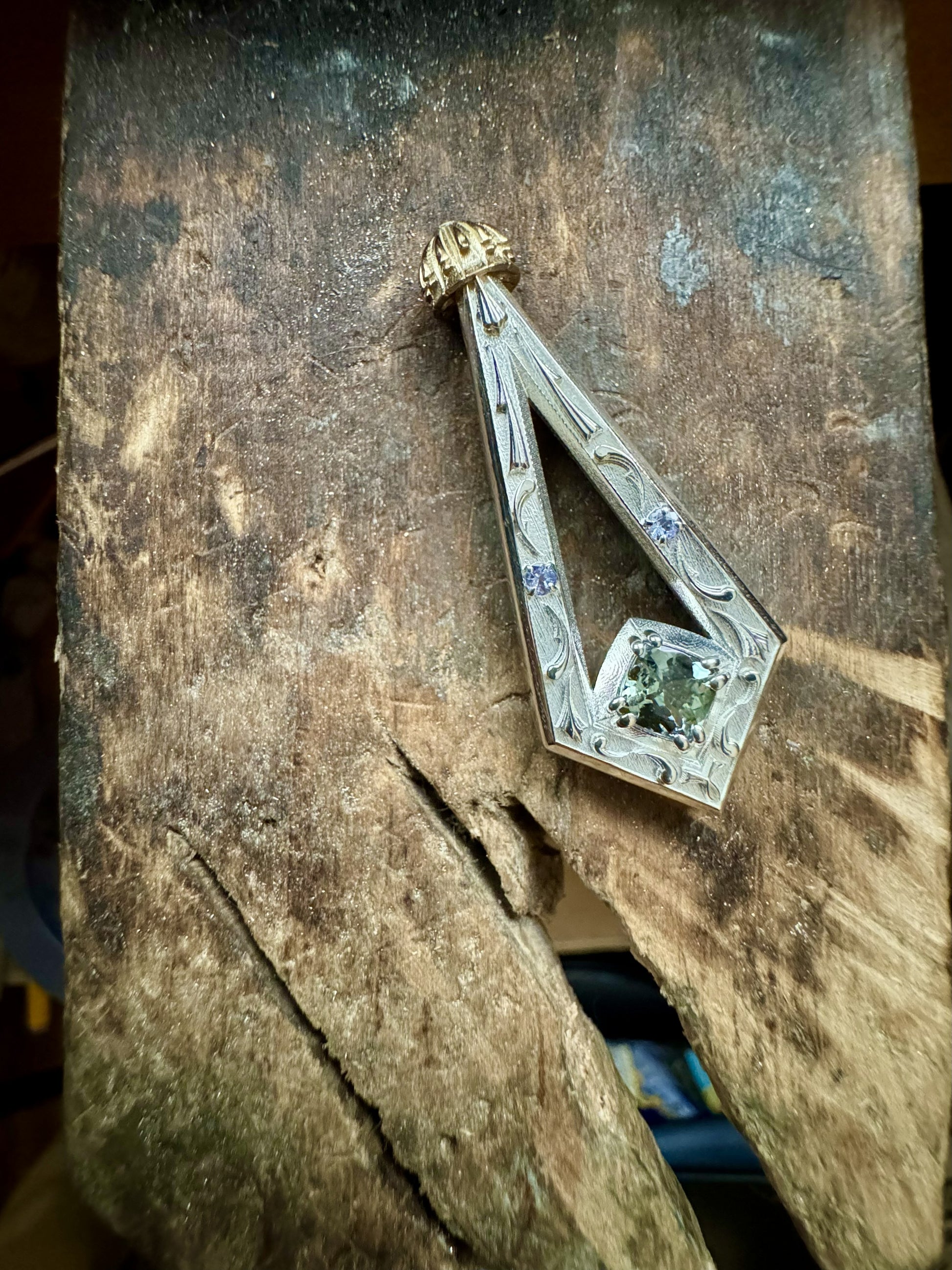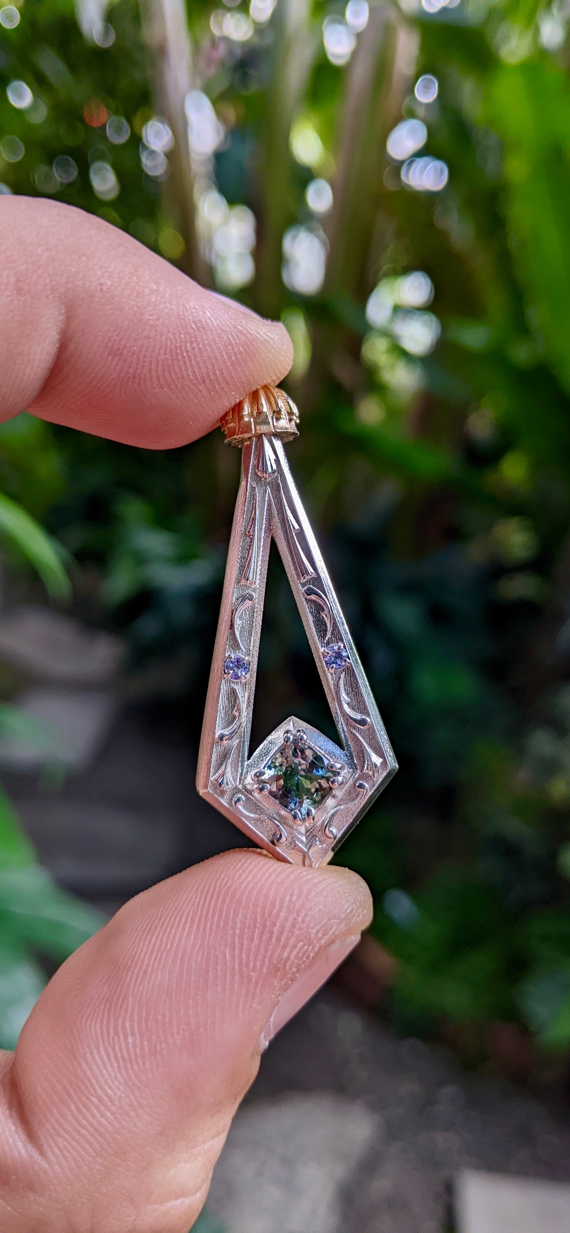 This one‑of‑a‑kind pendant features 0.9ct of ethically sourced Tanzanite, set within ornately fabricated 925 Sterling Silver and crowned with a 1g 14k Gold dome. The geometric teardrop frame and intricate detailing highlight the artistry behind this prototype design, blending regal elegance with refined craftsmanship.