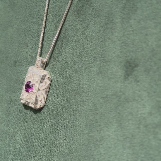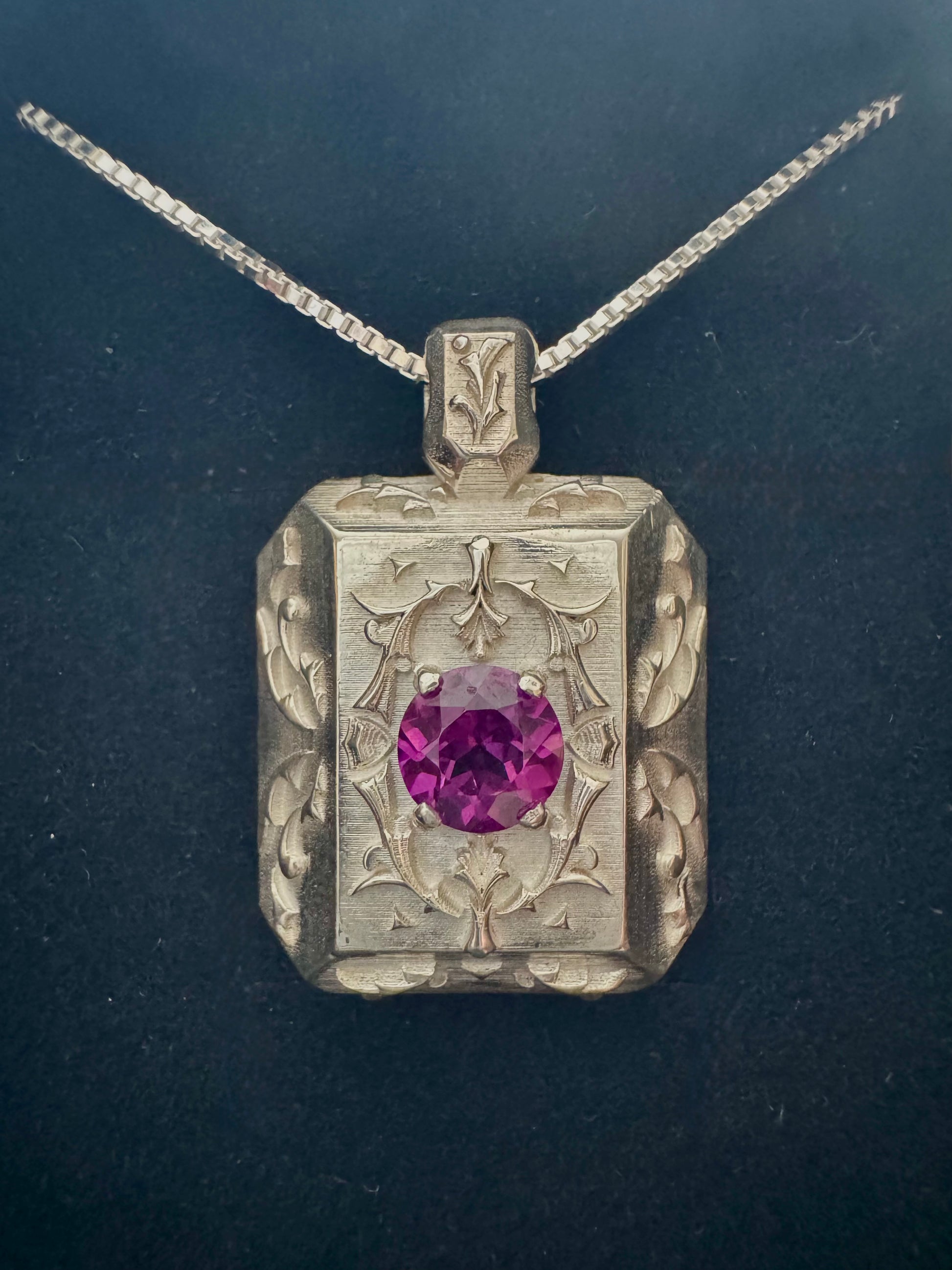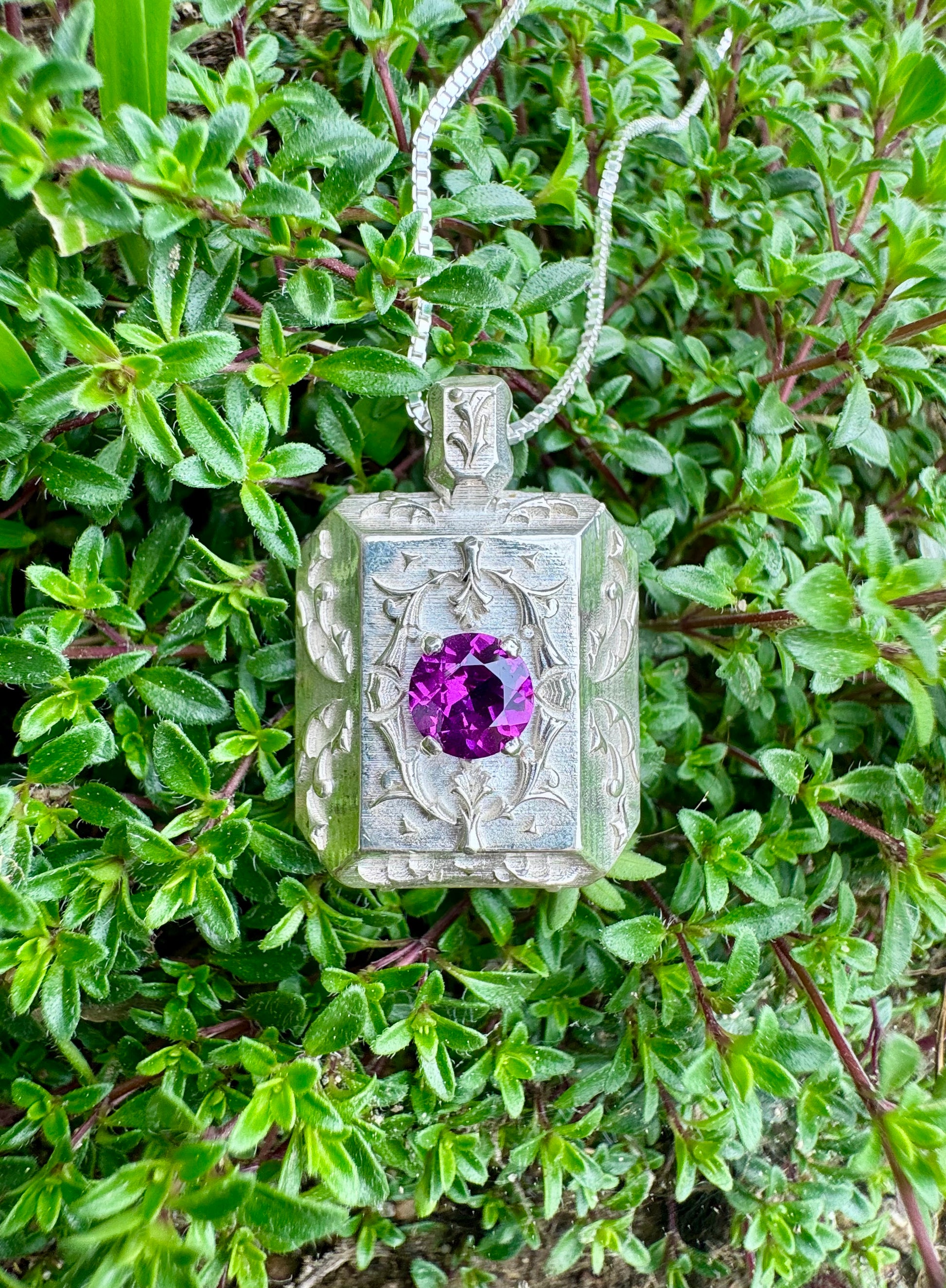 At the heart of this piece rests a captivating Pink/Purple Garnet, carefully set within an intricately sculpted sterling silver frame that mirrors the elegance of classical gallery displays. With a limited first run of 25 pieces, each pendant will boast a truly one-of-a-kind design, ensuring that no two are ever the same.