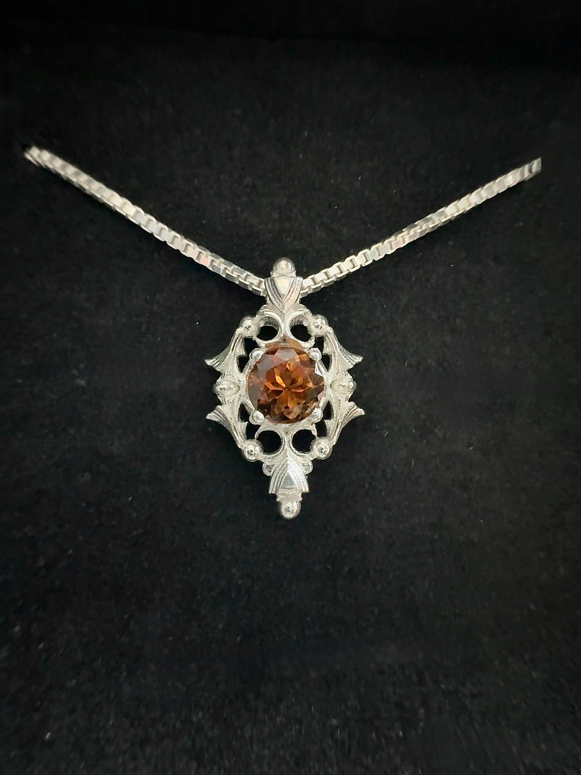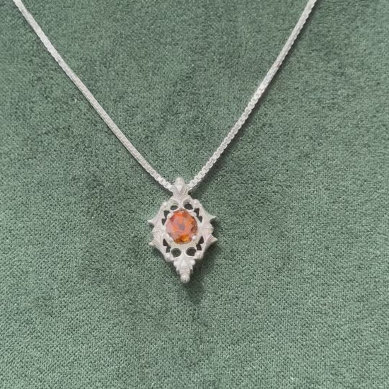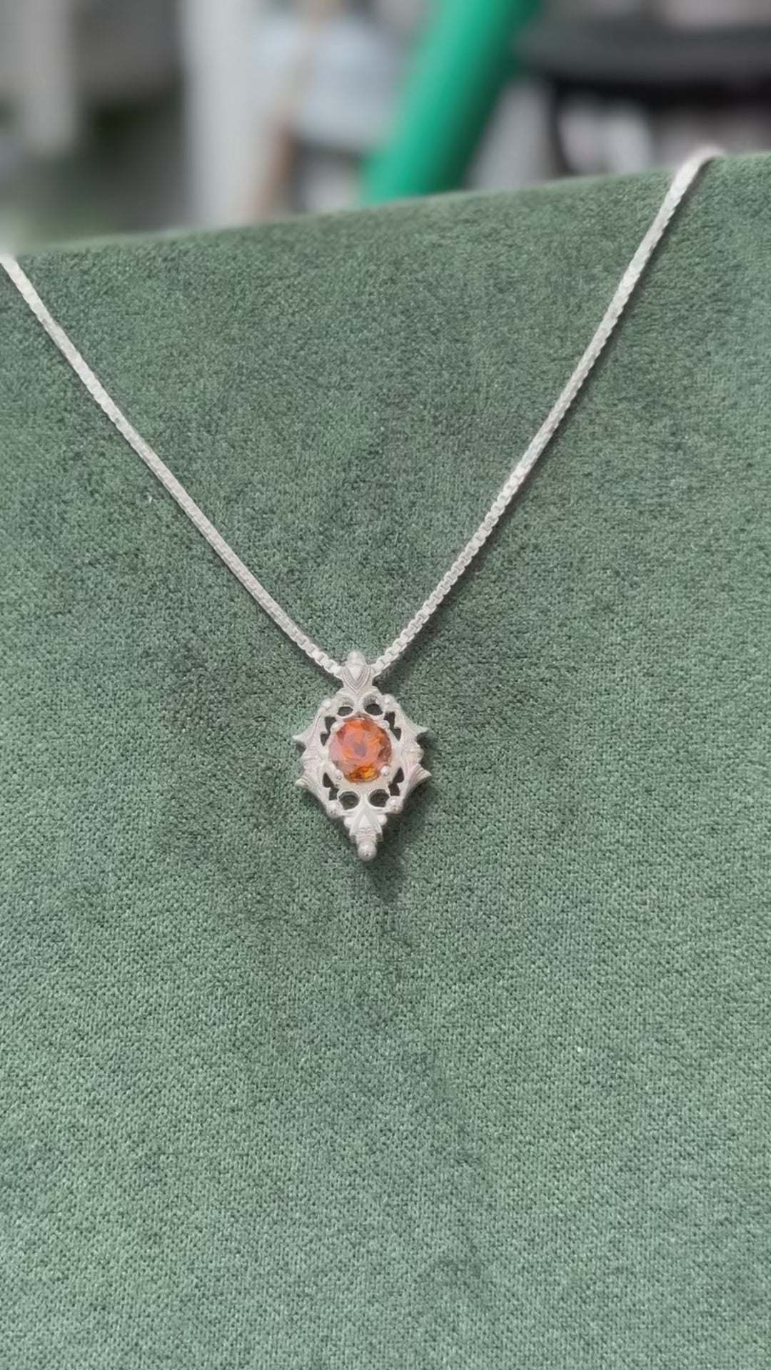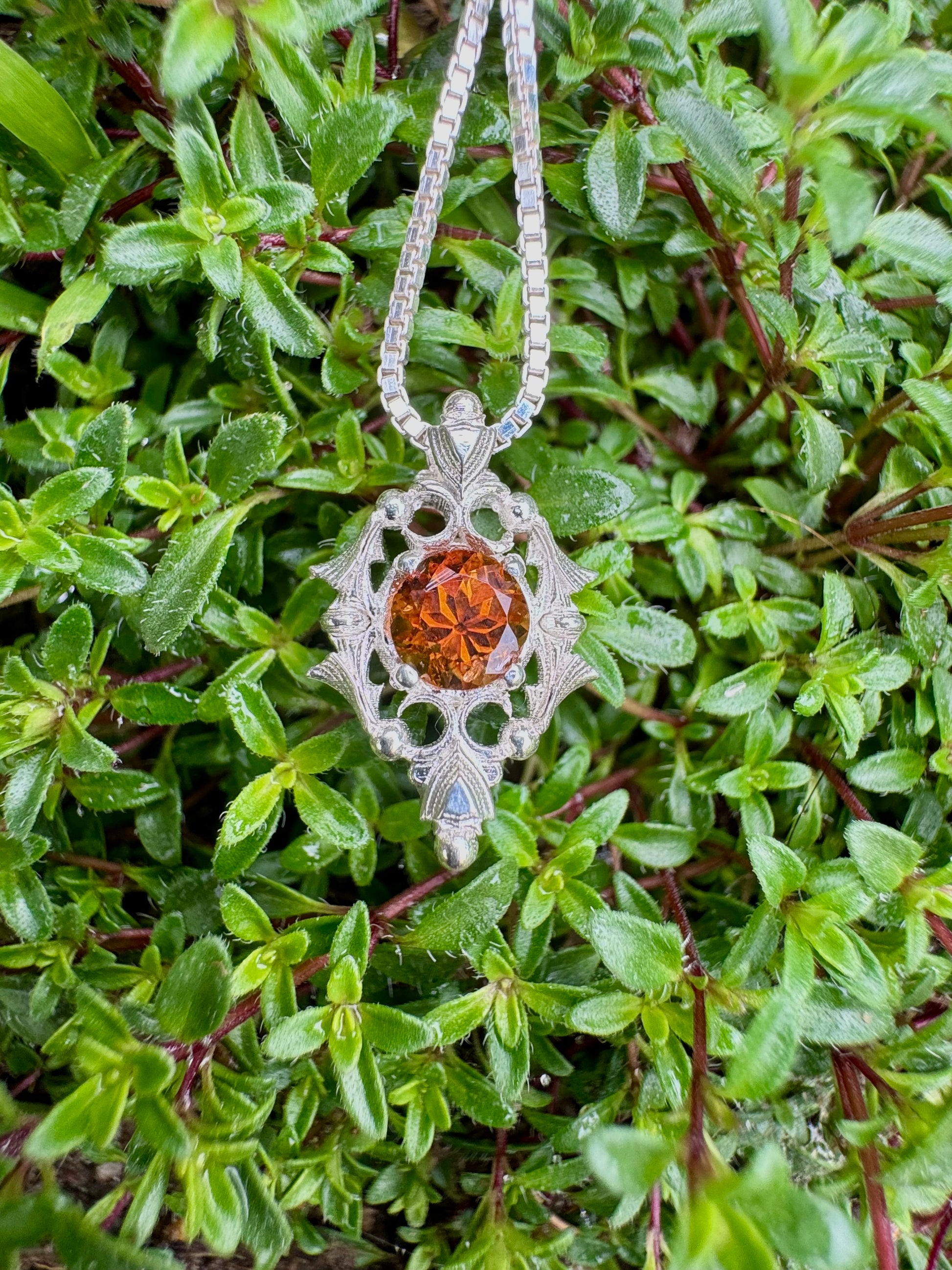 Inspired by the elegance of a larger design crafted last year,                                              The "La Piccola Principessa" Line captures the beauty of expertly faceted gemstones in a refined, solid, yet delicate form. This pendant features a vibrant Orange .45-.5ct Tourmaline, meticulously set in sterling silver, blending nature’s raw brilliance with masterful craftsmanship.