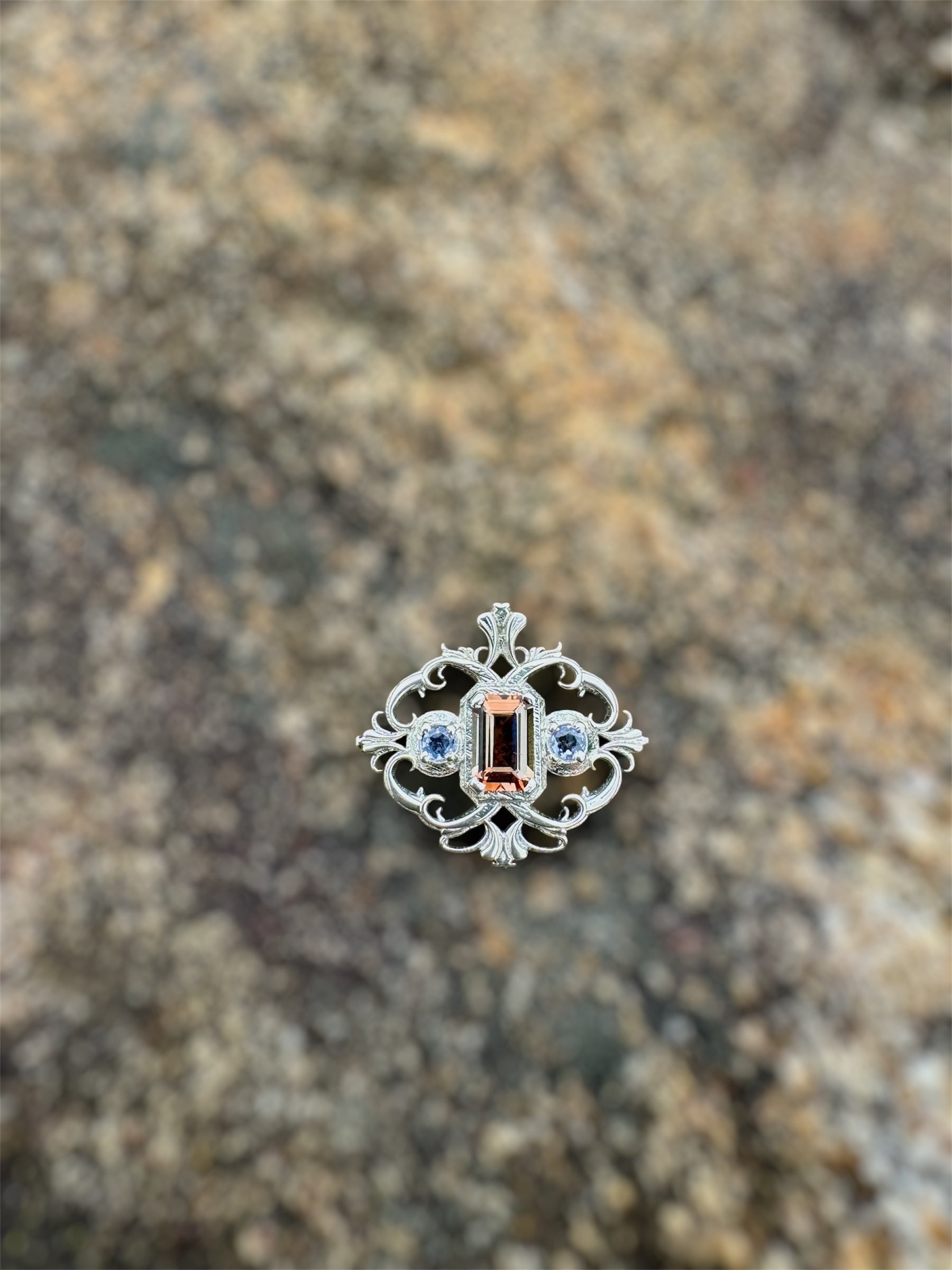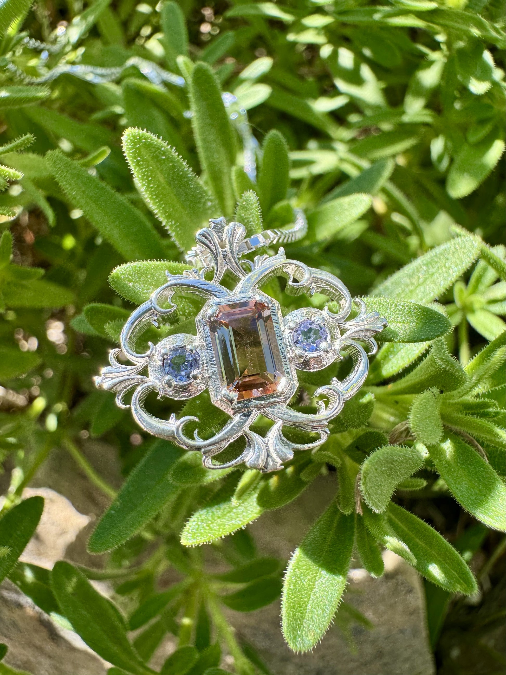 This one-of-a-kind creation features a .5ct Andalusite, its earthy brilliance enhanced by two vivid Tanzanite accents. Both gemstones are celebrated for their pleochroism—shifting colors that reveal new dimensions when viewed from different angles.