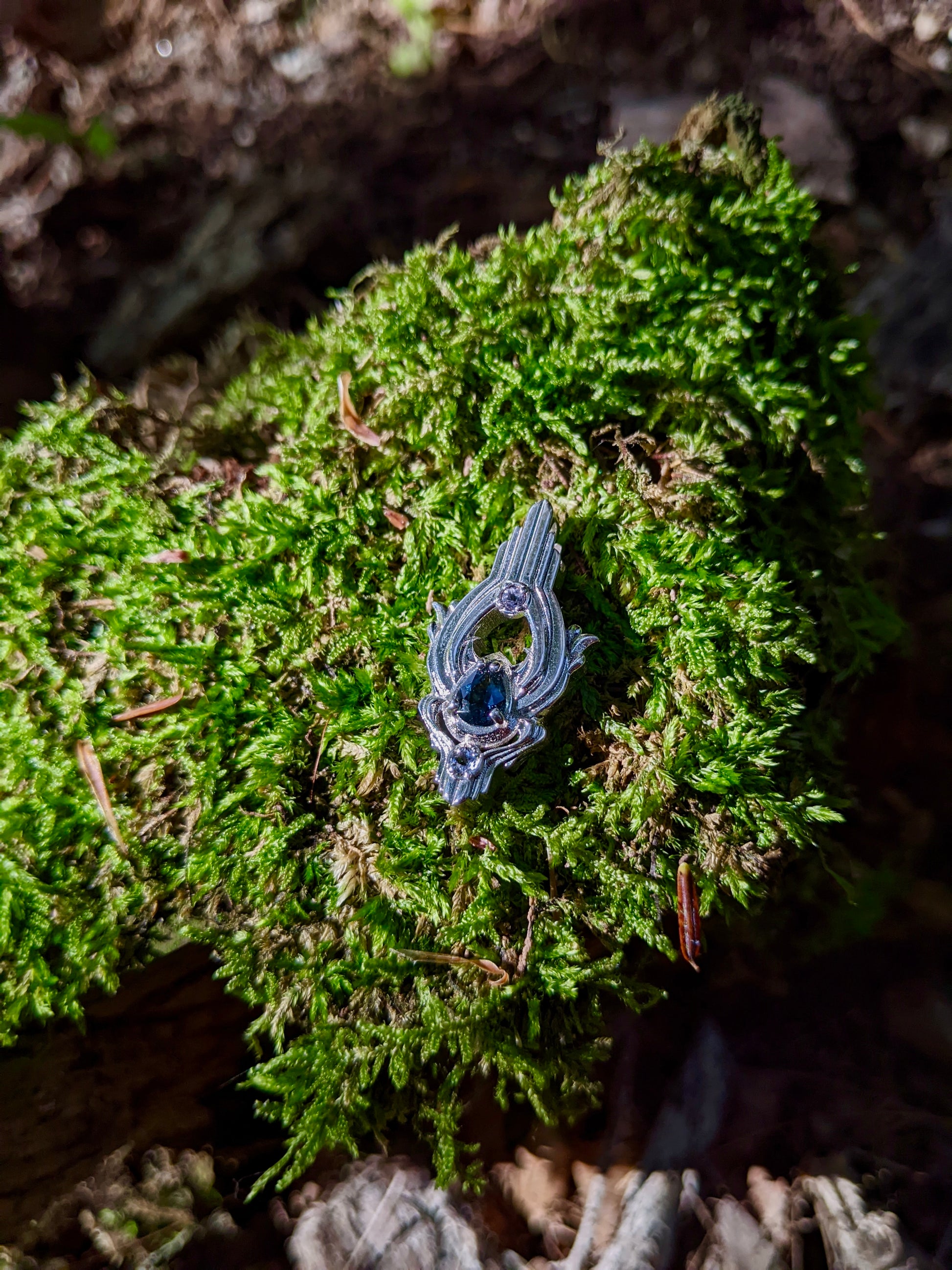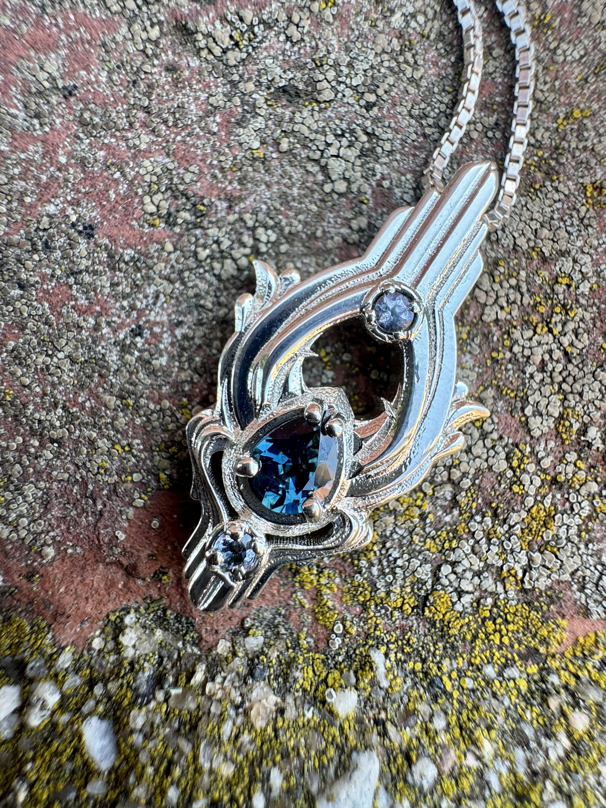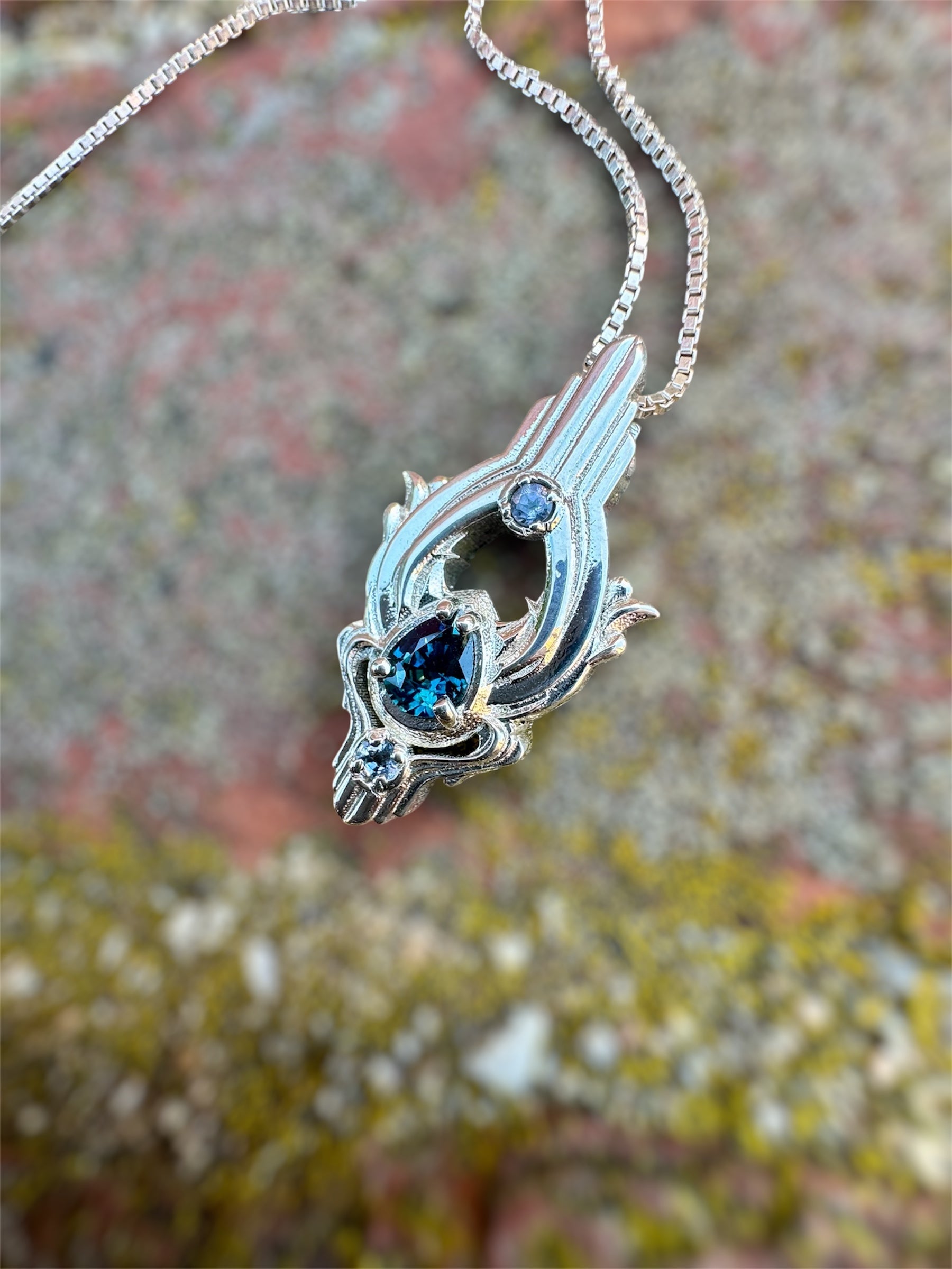 The Valkyrie II pendant is a handcrafted sterling silver necklace featuring a certified 0.5 ct natural, no‑heat blue/green bicolored sapphire. Its rare shifting hues are accented by two light blue Tanzanite gemstones, creating a luminous balance of color and brilliance. Inspired by Norse legend, the flowing wing‑like design embodies the strength and grace of the Valkyrie, making this sapphire pendant both a work of art and a symbolic talisman. Perfect for collectors seeking unique gemstone jewelry with authenticity and meaning.